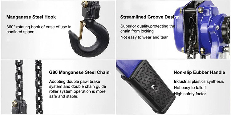 2. Chiều cao nâng tiêu chuẩn: 1,5 m, 3 m, 6 m 10m, 20m, v.v. (chiều dài xích đơn). Chiều dài chuỗi có thể được tùy chỉnh.