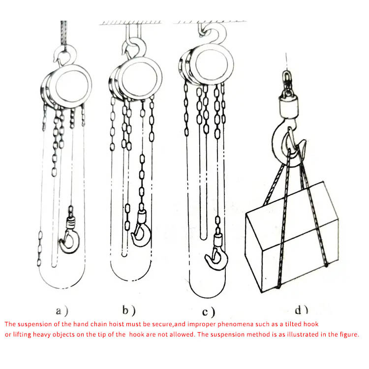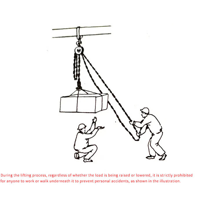 Nghiêm cấm quá tải: Trọng lượng nâng không bao giờ được vượt quá tải trọng định mức (ghi trên bảng tên). Không sử dụng bất kỳ nguồn điện nào ngoài lực thủ công để kéo xích.
