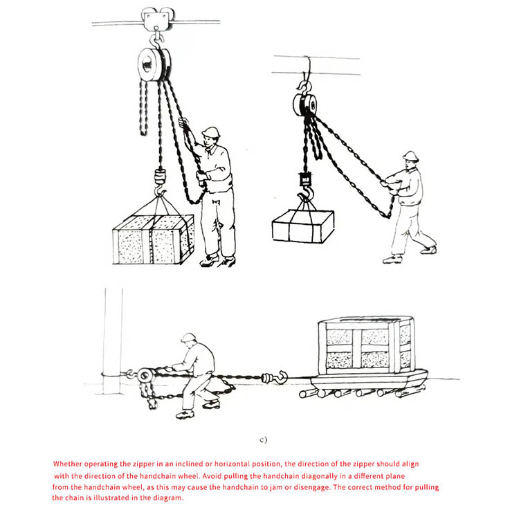 Kéo đúng: Kéo xích tay nhẹ nhàng và thẳng đứng dọc theo hướng xích; không kéo nghiêng hoặc nhờ nhiều người kéo mạnh.